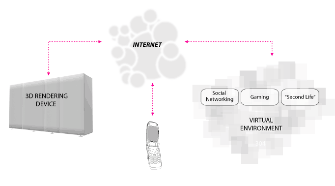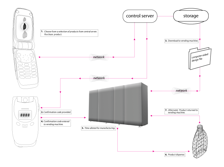 Pedestrian Product Vending Machine // product and system (speculative/patent pending) // This vending machine, a three-dimensional rendering apparatus, functions as an automatic retailing apparatus that dispenses products. It includes a material storage area, which is configured to store manufacturing based materials (e.g., thermoplastic polymer) and an automatic identification method, (A.I.M.)/Reconfigurable chip (e.g., RFID tag).