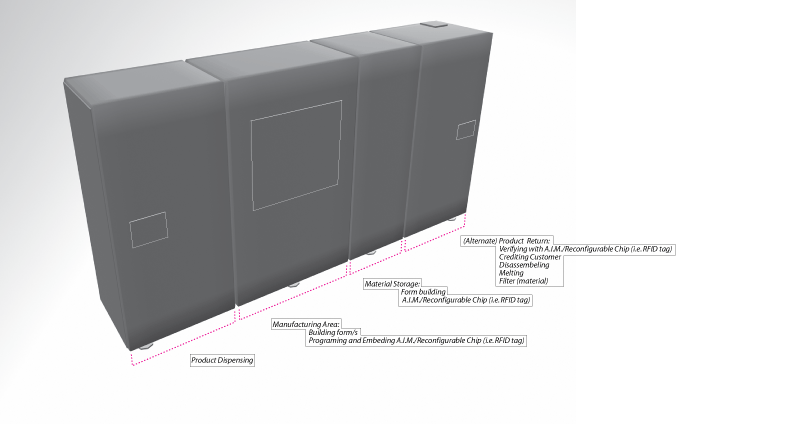 It is equipped with a "product return area," for returning products and verifying their recycling compatibility with the A.I.M./RFID tag. The material utilized to make the product such as, thermoplastic polymer, can be recycled (e.g., re-melted and re-molded) by this vending machine for future use. Money or credit can be credited to the consumer who has returned a product to the vending machine for successful re-melting and storing.